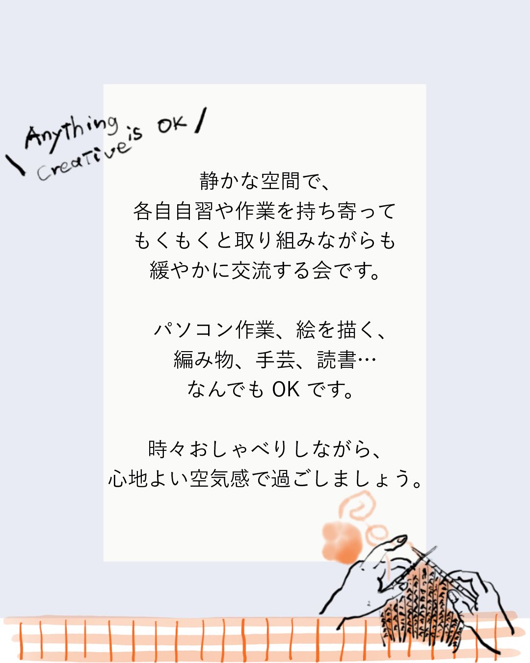 9/20(土)16:00から2階のテーブルエリアにて、もくもく会というイベントが開催されます。静かな空間で、それぞれの作業や学びを持ち寄り、「もくもく」と集中しながらも、ゆるやかに交流する会です。